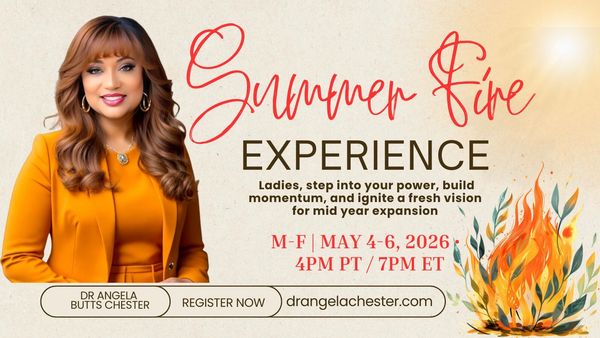 Summer is the season of courage, clarity, and divine acceleration. The Summer Fire Experience helps you tap into your God given boldness, ignite your confidence, and step into the next season of your calling with power and purpose. Registration opens soon.